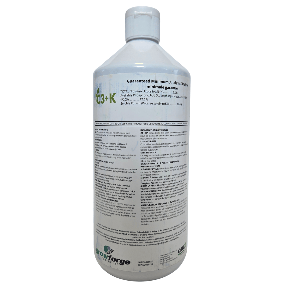 C3-K is a low salt index 6-12-12 liquid fertilizer that boosts the metabolism, provides energy (high Phosphorus analysis) and relieves the crop from early-season stress. We recommend this for all legume plants such as clover, alfalfa, chicory, and peas. Each 1L bottle does a 1/4 acre. Mix with 4-8 gallons of water. Spray early morning or late evening.