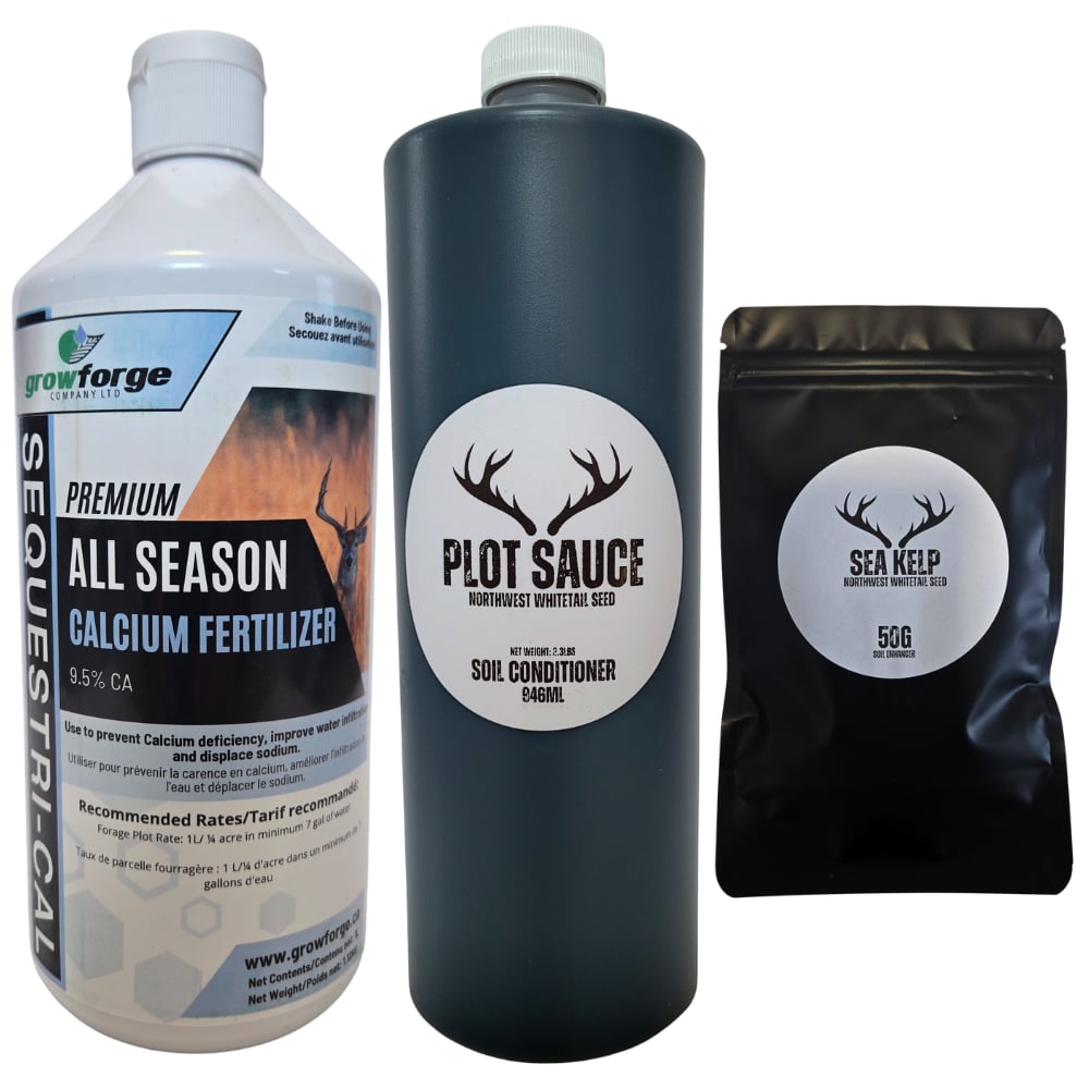 Why not save some cash and enhance your soil health at the time! Our soil conditioning combo pack consists of Plot Sauce with Sea Kelp and Seq Cal liquid calcium. This combo will cover a 1/4 acre food plot.