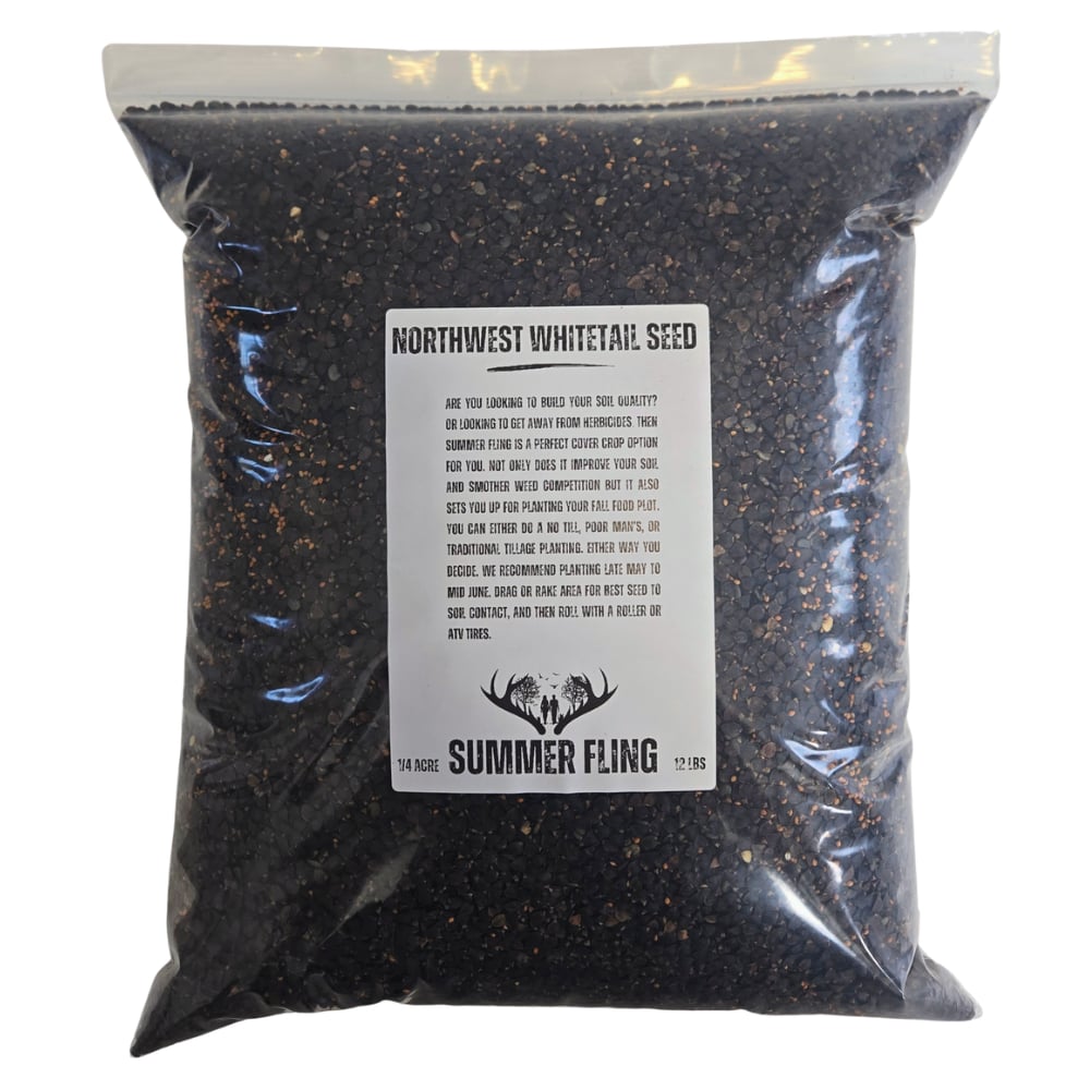 Are you looking to build your soil quality? or looking to get away from herbicides. Then Summer Fling is a perfect cover crop option for you. Not only does it improve your soil and smother weed competition but it also sets you up for planting your fall food plot. You can either do a no till, poor man’s, or traditional tillage planting. Either way you decide. We recommend planting late May to mid June. Drag or rake area for best seed to soil contact, and then roll with a roller or atv tires. Plants 1/4 acre per bag